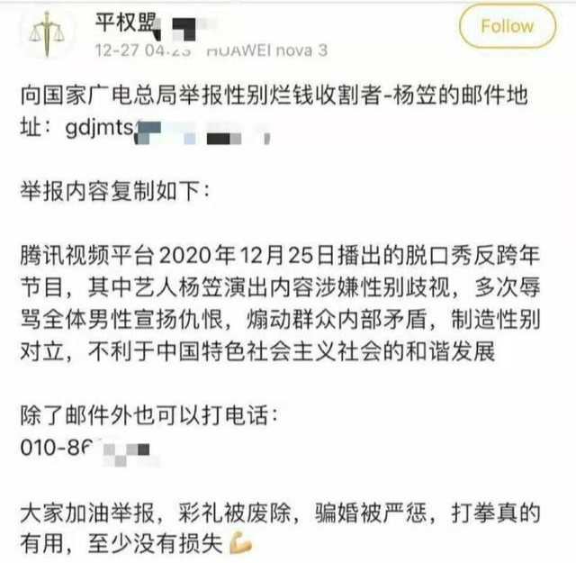 到了2021年底,在《反跨年脱口秀大会》上刚演出完的杨笠,直接被网友举报到了广电总局,罪名是: