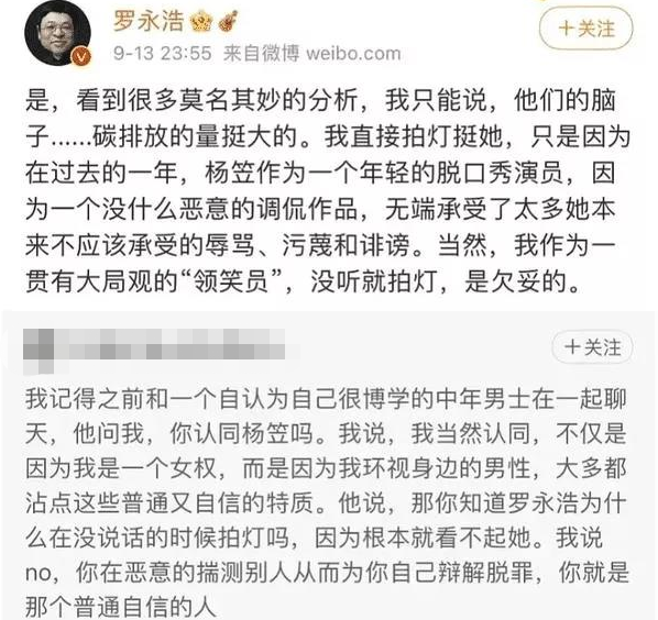 罗永浩说:“杨笠因为没有什么恶意的调侃作品,承受了太多不应该承受的辱骂、污蔑和诽谤。”
