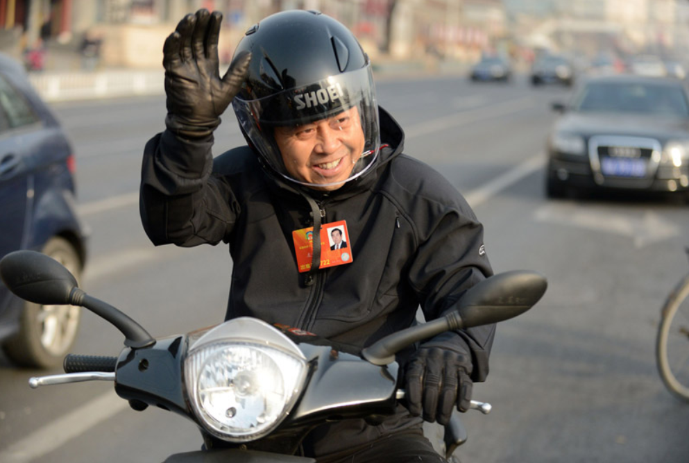 2013年,左宗申在两会期间骑着摩托体验北京交通
