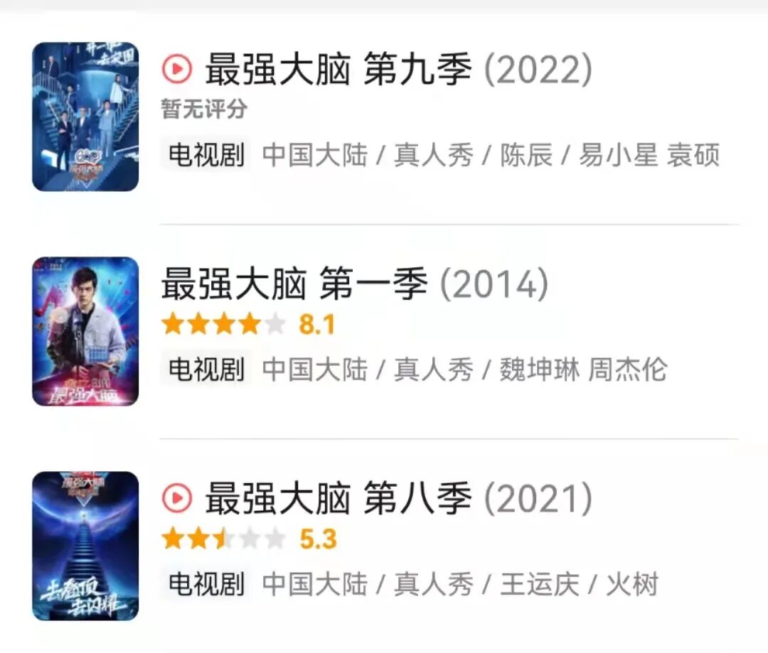 但到后来,《最强大脑》的评分从第一季的8.1,逐渐降到了第八季的5.3。