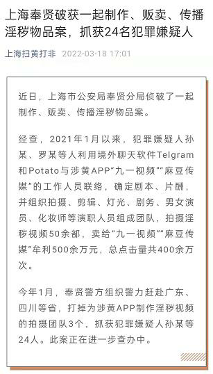 事件起因,是上海警方发布官方通告,与广东、四川联手打掉了3个色情视频拍摄团队,共逮捕了24人。