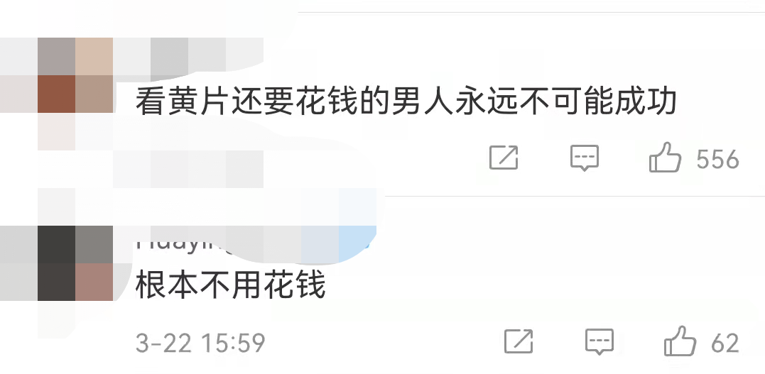 微博上就有高赞评论:“看黄片还要花钱的男人永远不可能成功。”