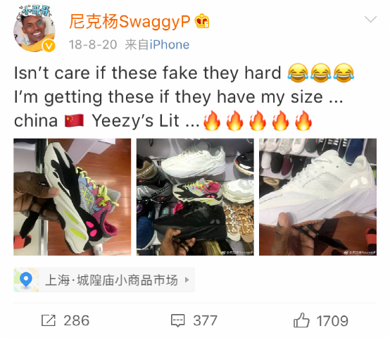 2018年,NBA球星尼克杨来华,大赞假“椰子鞋”。