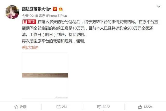 关于为什么一定要走,张大仙在自己的微博中说:“在原平台一共只拿到了18万元的税前工资。”