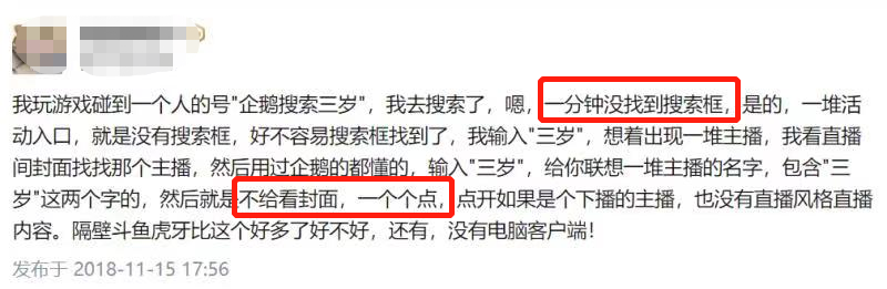 而且连搜索栏都被设置得非常难找,找主播总是要到不同栏目之下一个个看。