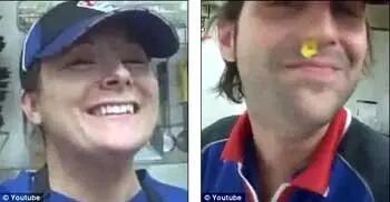 拍摄录像的女员工和把奶酪放在鼻孔里的男员工