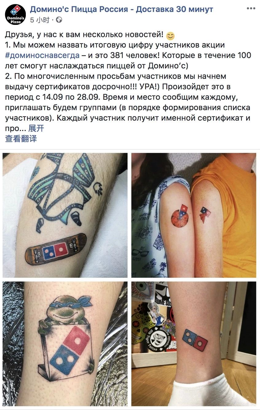 在俄罗斯,只要在身体显眼的部位,纹上达美乐的品牌logo,上传照片到facebook等社交网站,就能够终生免费吃批萨。
