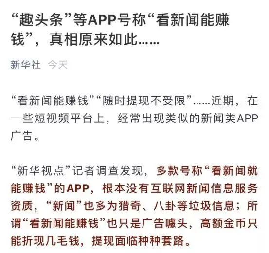 2019年5月,新华社微信公众号发布文章,痛批趣头条等APP内容低俗:“他们根本没有互联网新闻信息服务资质,‘新闻’也多为猎奇、八卦等垃圾低俗信息。”