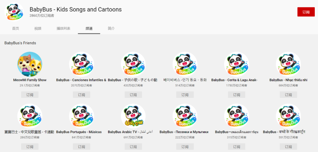 在YouTube所在儿童内容的播放量上,宝宝巴士更是在日语频道、葡萄牙语频道、西班牙语频道等8个语种排名第一!