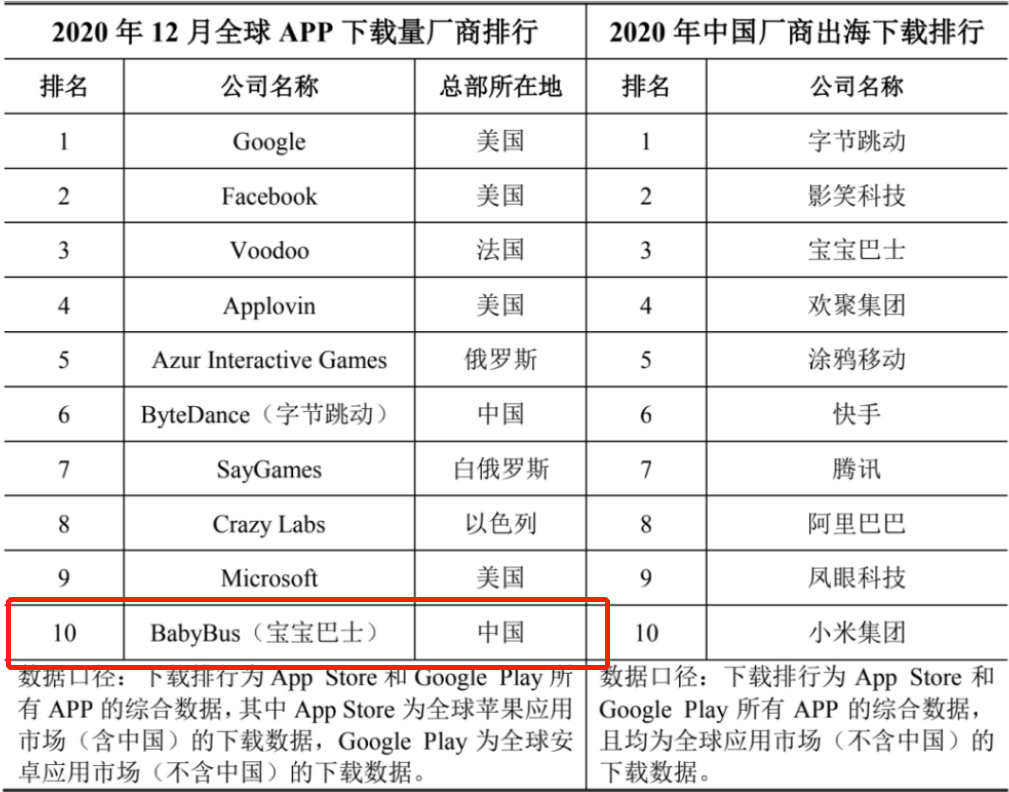 2020年,APP Store和Google Play合并渠道中下载量排名前十的应用中,总共只有两家中国企业,一家是字节跳动,另一家就是宝宝巴士。