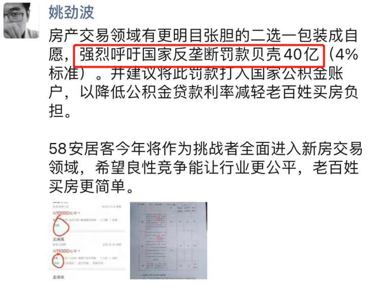 后来,姚劲波第一个跳出来要求监管方处罚贝壳40亿元,并建议“将此罚款打入国家公积金账户,减轻老百姓买房的负担”。