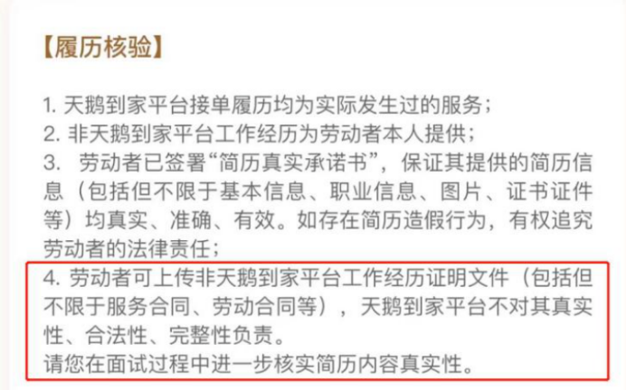 但打开天鹅到家App,在月嫂简历技能认证一栏,点开下方的“了解更多”后,在履历核验上有几行灰色小字提醒,可能很多人都不会注意:
