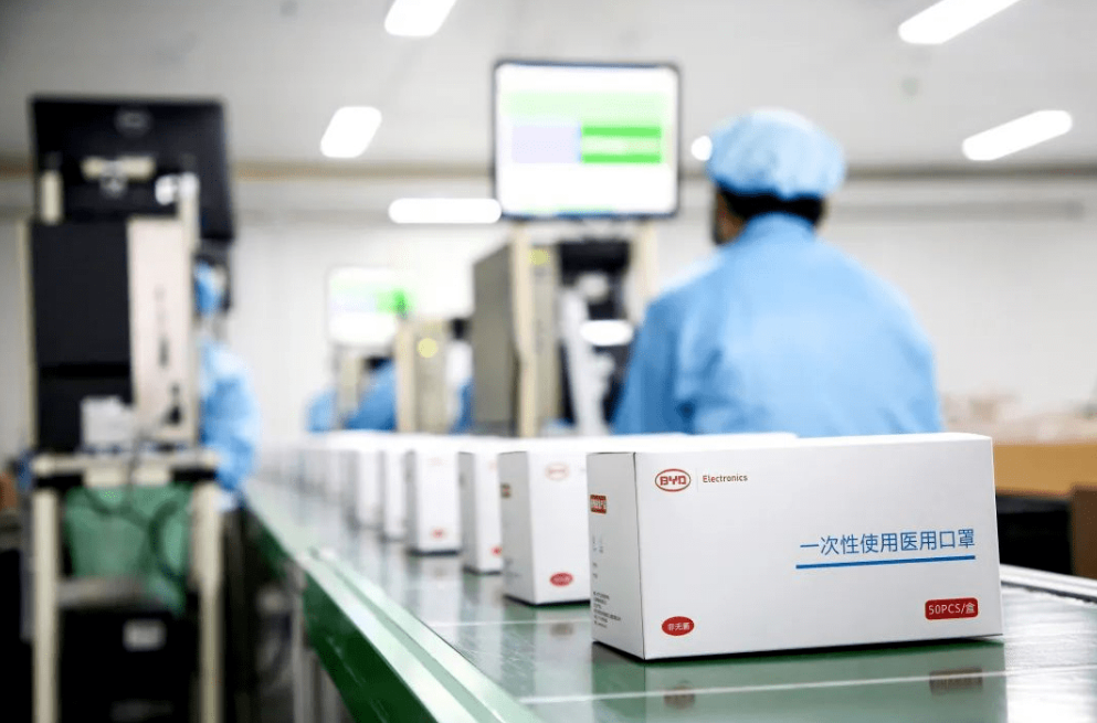 疫情那会儿,比亚迪又成为了全球第一大口罩厂,三天出图纸,七天出设备,十天下线,日产量能达到1亿只。