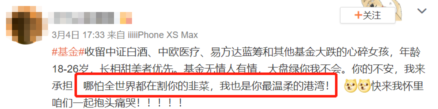 尤其是在计收益率越高的基金讨论区,像白酒型基金和医药科技类基金评论区,征婚消息格外多。