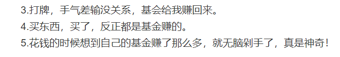 比如,当基金赚钱的时候,有人就会想:基金赚了这么多钱,花点也没关系吧,然后就花了。因此对于很多年轻基民来说,买了基金反倒开销更大了。
