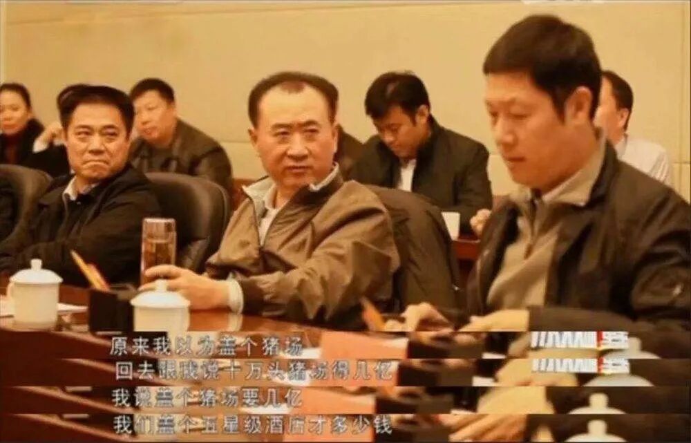 王健林在一次会议上说:“原来我以为盖个猪场,回头跟我说十万头猪场得几亿。我说盖个猪场要几亿?我们盖个五星级酒店才多少钱?”