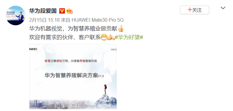 今年2月,华为机器视觉领域总裁段爱国就发微博称,华为推出了“华为智慧养猪解决方案”。