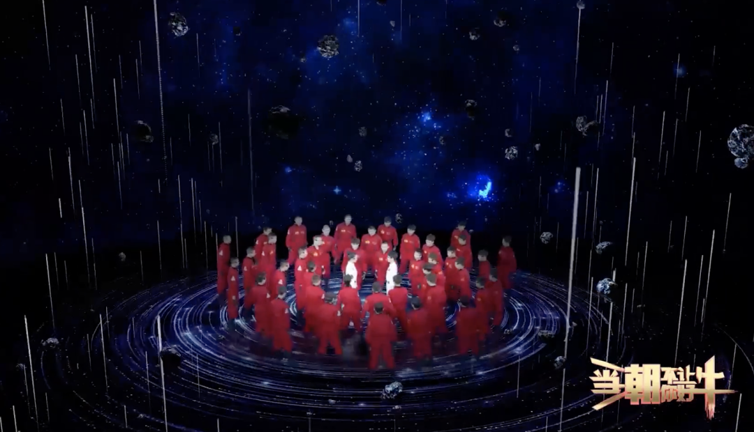 看看这舞台装置,演员穿着宇航服打太极,站在星河宇宙之间,周围都是飘落的陨石。