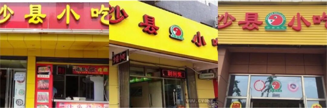 无论是时髦的大都市,还是小县城,沙县小吃的招牌都是大红大黄配色,几个大字配上贪吃豆的logo,就能开门营业。