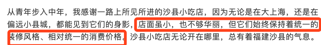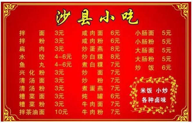 就像网友说的:沙县小吃店面虽小,也不够华丽,但他们始终保持着统一的装修风格,相对统一的消费价格,总有沙县的气息。