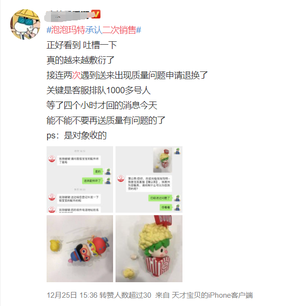 有网友表示,泡泡玛特客服送来的产品质量也屡次出问题。