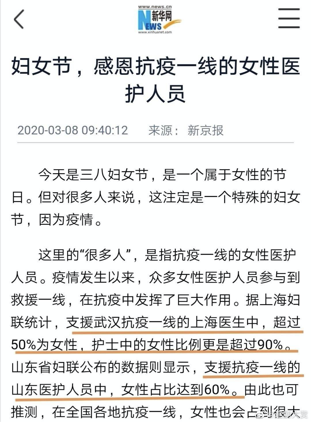 而根据地方媒体报道,各省奋战在抗疫一线的医护人员中女性占比均过半数以上。