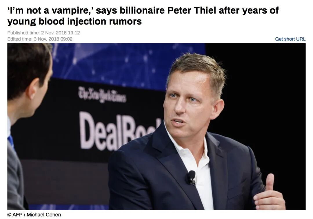 硅谷大神 Peter Thiel,传说他每季度会花费 40000 美元,给自己体内注入 18 岁年轻人的新鲜血液,为的是永葆青春、延年益寿,甚至因此得到网友赐予的“吸血鬼”称号。