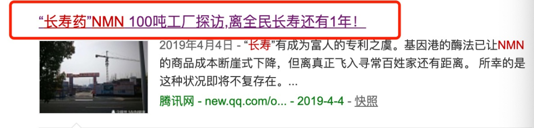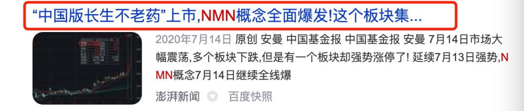 随便一搜NMN都会看见其和“长寿药”密不可分,甚至有新闻宣传说,离全民长寿还有1年。