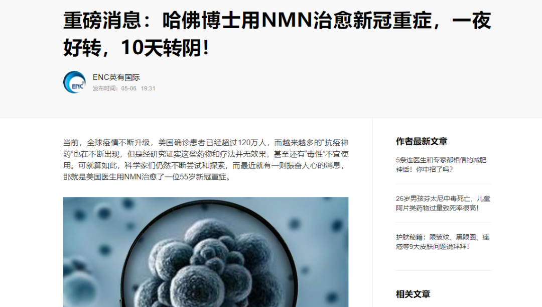 今年,全球爆发新冠肺炎,NMN厂商自然不会错过这个百年一遇的机会,声称NMN可以预防、治疗新冠病毒感染: