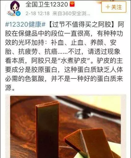 2016年,人民日报也曾引用果壳网等资料,称阿胶由驴皮熬制,主要成分是胶原蛋白,和猪皮、牛皮及其他皮的成分并无太大不同。