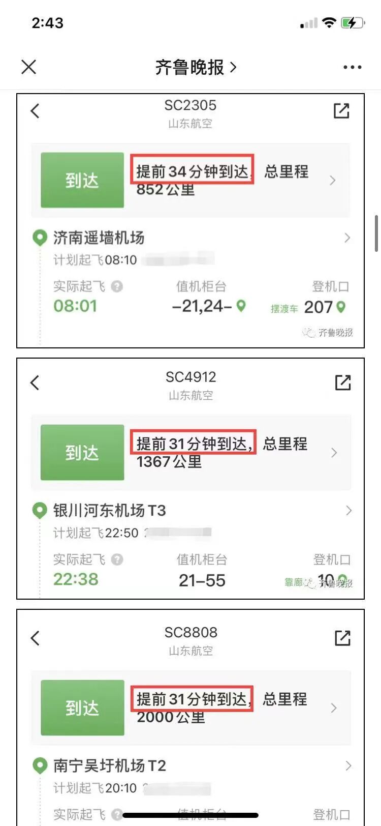 不少网友晒出了自己的登机列表,其他航空公司都是准点或者延迟,而山航显示的都是“提前到达”。