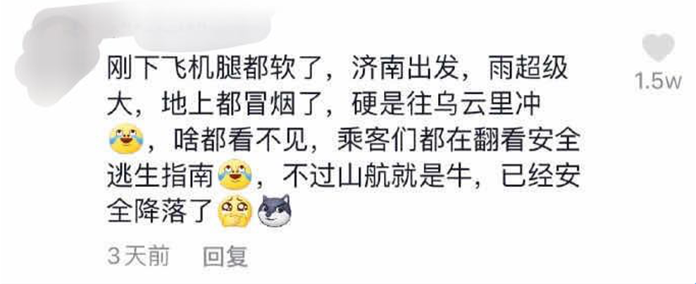 有人说,在最近的暴雨天气中,山航不仅敢起飞,还能“硬怼”乌云。
