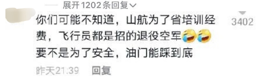 此前就有不少网友表示,山航之所以飞的那么“猛”,是因为山航飞行员都是空军出身,不仅素质硬,还可以省下不少培训费。
