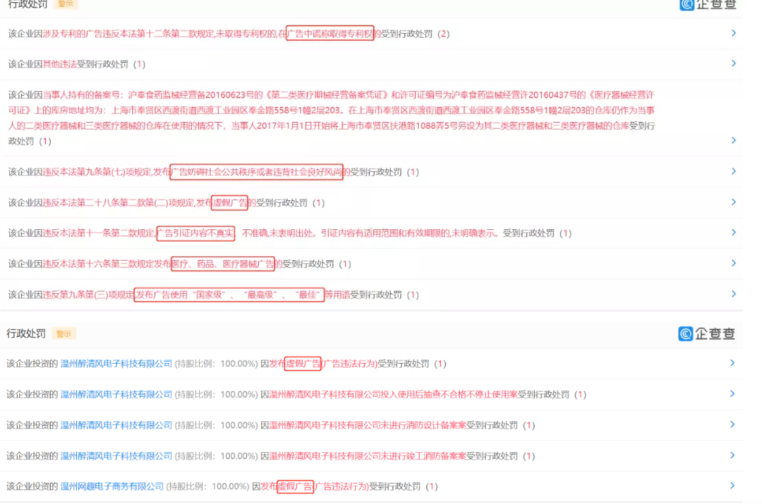 企查查显示,从2018年10月到2020年11月两年的时间,醉清风发布的产品广告被罚了不下10次。