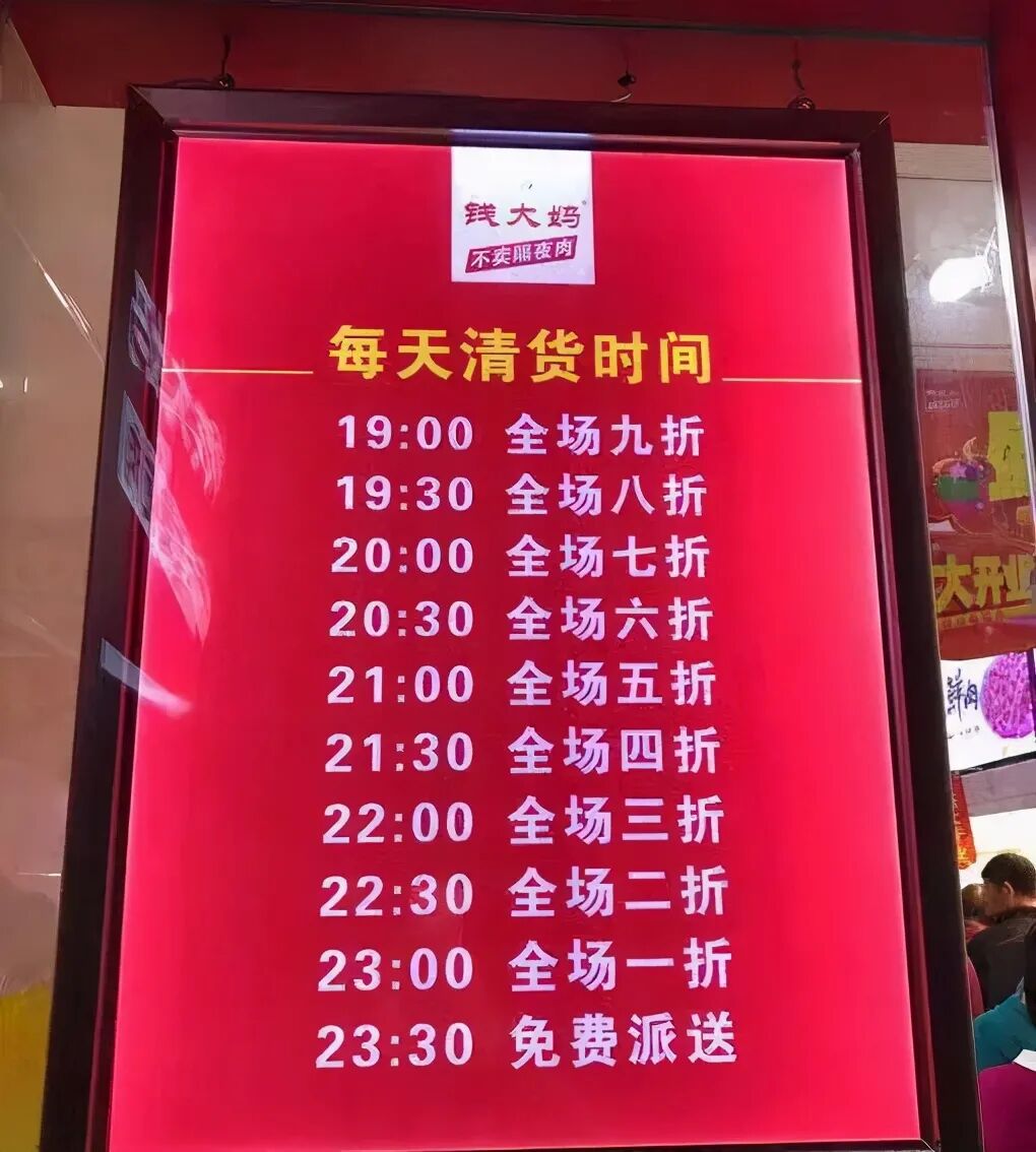 到了晚上七点后,钱大妈每半小时就开始打折,十一点半后免费送。