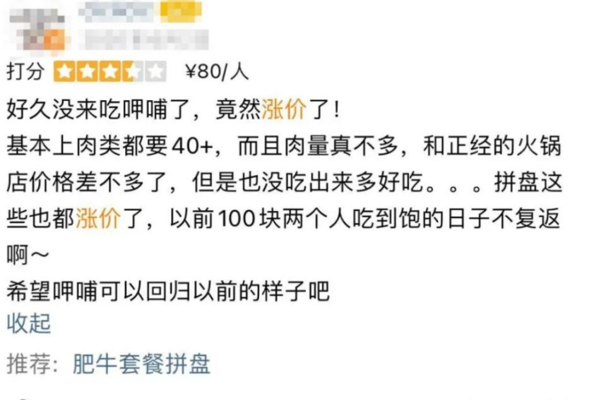 这两年,呷哺的价格是肉眼可见的涨,从35就能吃饱,涨到人均60-80,产品还是老产品,但价格已经变得高攀不起。
