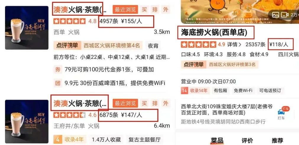 在大众点评上,湊湊北京君太百货店,客单价为155元/人,王府井大街店147元/人。而海底捞西单店的客单价也才118元/人。