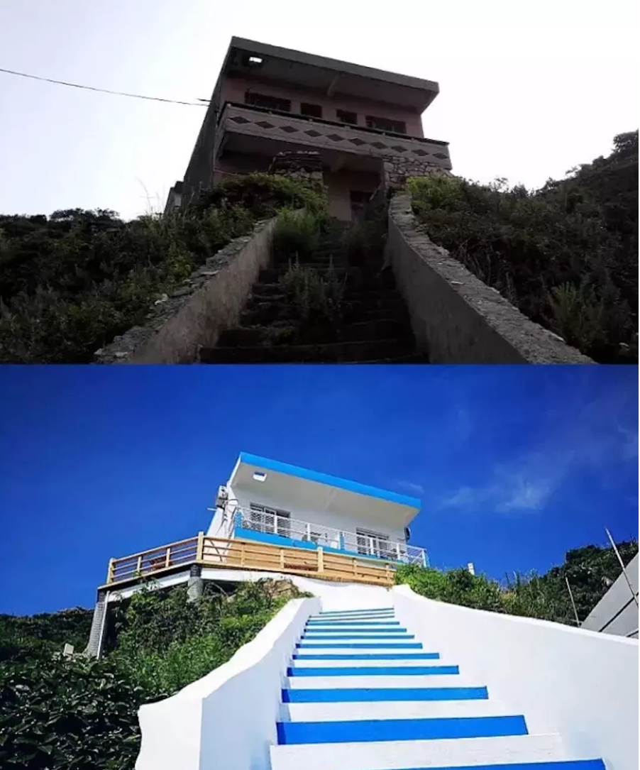 2015年,花鸟岛上的一位民宿老板通过蓝白色的装修,让民宿焕然一新,原本荒废的建筑,成了短视频平台上爆火的 “小圣托里尼风味旅馆”。