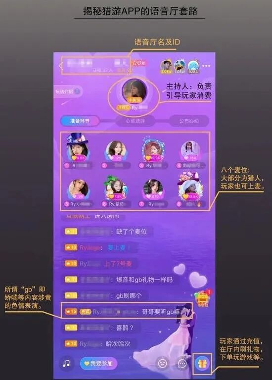 在猎游的语音厅里,如果用户愿意每人支付5-10元,就能得到“高爆”服务。“高爆”是具有涉黄性质的语音,例如女陪玩娇喘、呻吟等诱惑声音。用户花得越多,陪玩的语音尺度就越大。