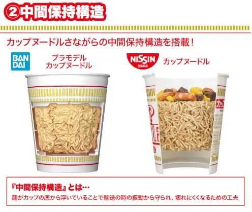为了解决这个问题,日清特地把杯子从圆筒改成梯形,让面饼“卡在”杯子里,不容易断。