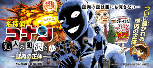 日清还和柯南合作,推出了一期“谜肉的真相”漫画。