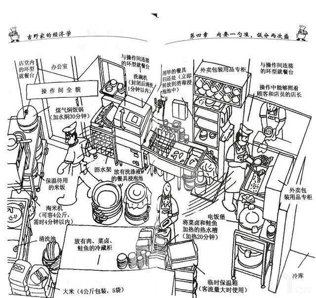 吉野家开发出47孔漏勺,让米饭不结块,还把厨房安排的满满当当,极致压缩空间。