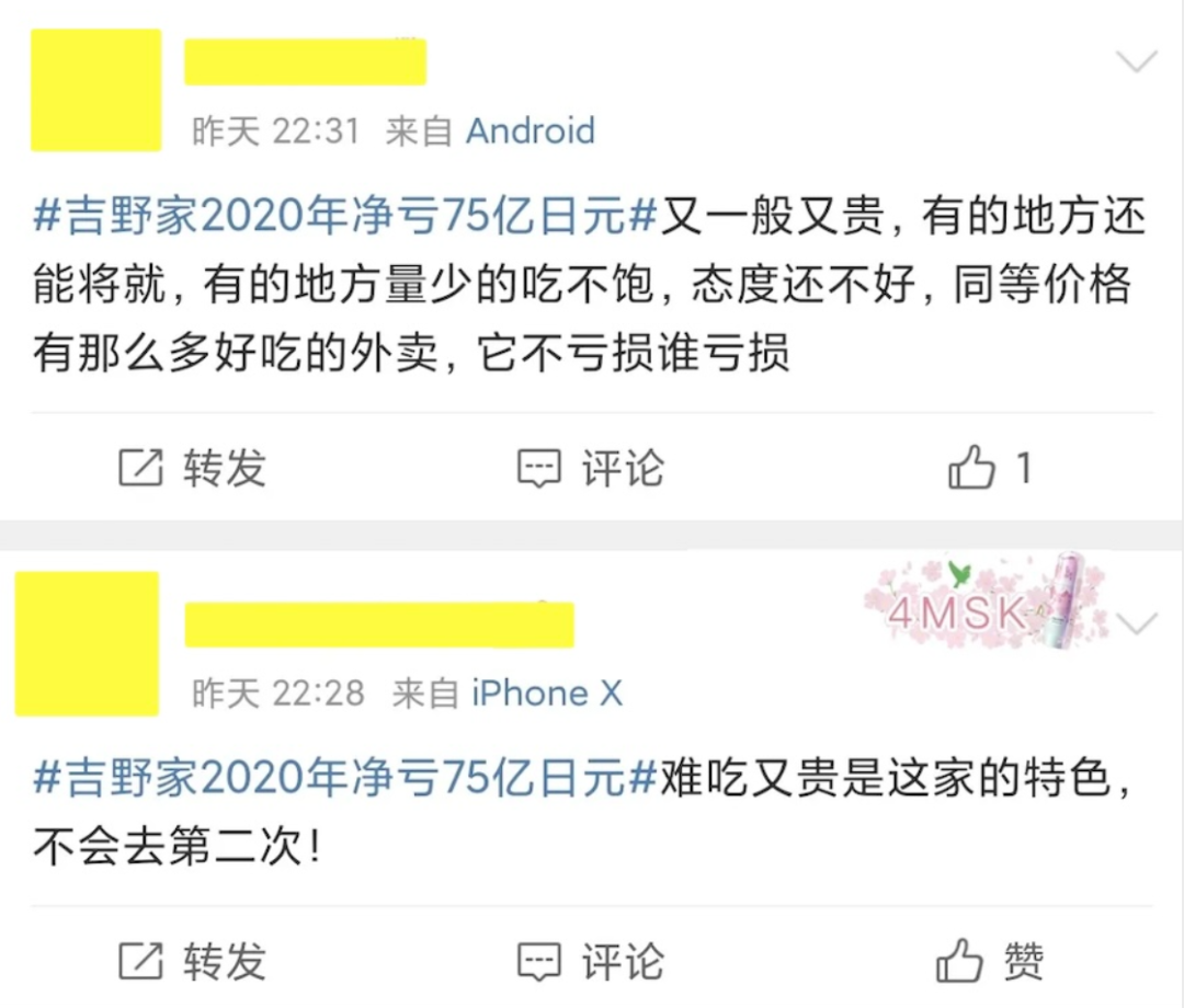 不仅在日本,吉野家备受吐槽,在国内也是如此。消费者变得见多识广,吉野家的“童年滤镜”开始破碎。