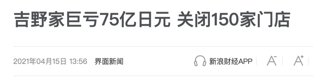 2020年,吉野家宣布,因长期亏损,关闭150家门店,当年财报更是巨亏75亿。