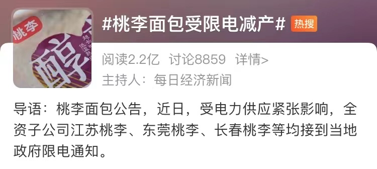 桃李面包宣布因限电要减产时,2亿网友将其送上了热搜,引起广泛关注。