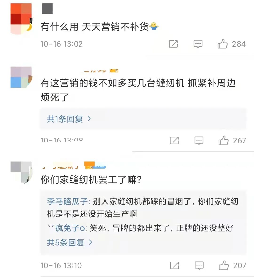 因为太难抢,一些粉丝“气急败坏”,在有关玲娜贝儿的微博下评论:“有这营销的钱,还不如多买几台缝纫机,抓紧补周边。”