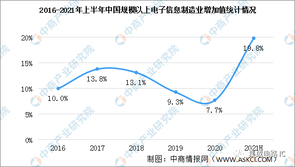 数据显示,2017-2020年我国规模以上电子信息制造业增加值增速减缓,2020年,我国规模以上电子信息制造业增加值同比增长7.7%,增速比上年回落1.6个百分点。2021年以来,规模以上电子信息制造业增加值增速加快。2021年上半年,我国规模以上电子信息制造业增加值同比增长19.8%,增速比上年同期提高14.1个百分点