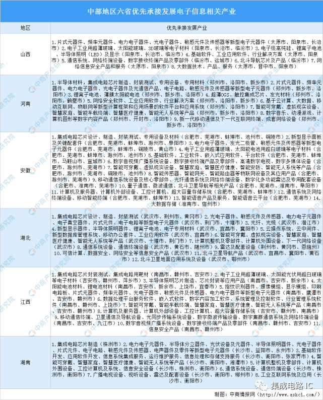 目前,中部六省积极布局电子信息产业,优先承接发展半导体材料、集成电路、电子电力器件、工业应用软件、电子高级硅等。