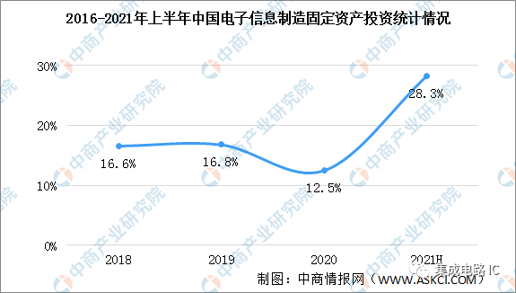 近年来,中国电子信息制造业固定资产投资持续增长。2020年,电子信息制造业固定资产投资同比增长12.5%,增速同比降低4.3个百分点。2021年上半年,电子信息制造业固定资产投资同比增长28.3%,增速比上年同期提高18.9个百分点。