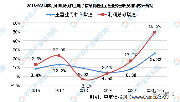 近年来,中国电子信息制造业收入保持平稳增长。数据显示,2020年,我国规模以上电子信息制造业实现营业收入同比增长8.3%,增速同比提高3.8个百分点;利润总额同比增长17.2%,增速同比提高14.1个百分点。2021年1-5月,规模以上电子信息制造业实现营业收入51118亿元,同比增长25.8%,实现利润总额2545亿元,同比增长49.3%。